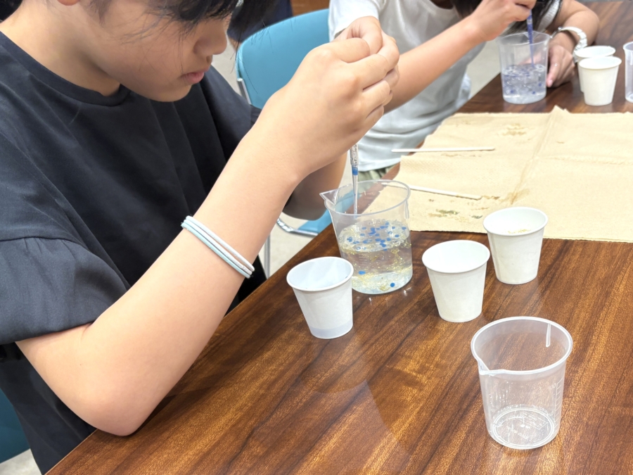この性質を利用して、ミミズのような形を作ったり、丸いツブツブをたくさん作ったりしてもらいました。スポイトの使い方を変えるだけで色んな形ができあがるので、お友達と見せ合いっこしながら楽しそうに作られていました。