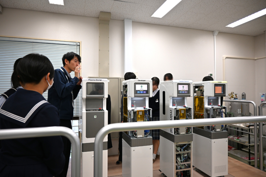 実験施設では「半導体の製造について学ぼう」と題して半導体の製造工程を体験したり、小型の半導体製造装置ミニマルファブを間近で見学し、説明を受ける等しました。