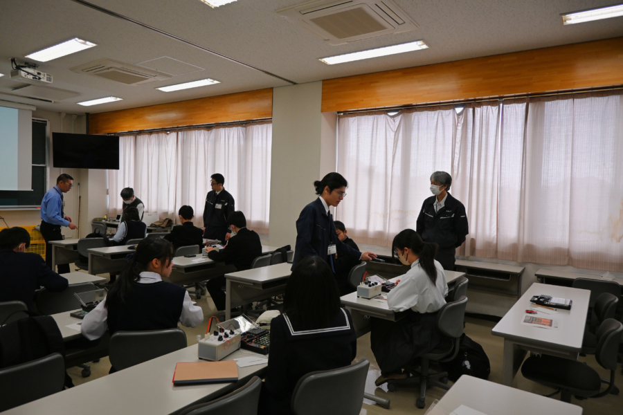 電気電子工学科の講座は体験型の講義で、参加した皆さんを2班に分けて交代制で実施しました。