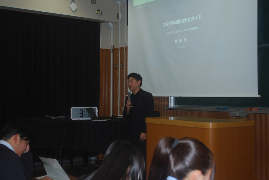 また、「学生起業は無敵状態」と銘打って、ご自身の経験を交えながら若者の挑戦を後押しする熱いメッセージを伝えていただきました。講演の後半ではAIの活用についても触れ、AIを「時間を生み出す手段」として捉え、ルールを守りながら賢く活用するポイントをご紹介いただきました。