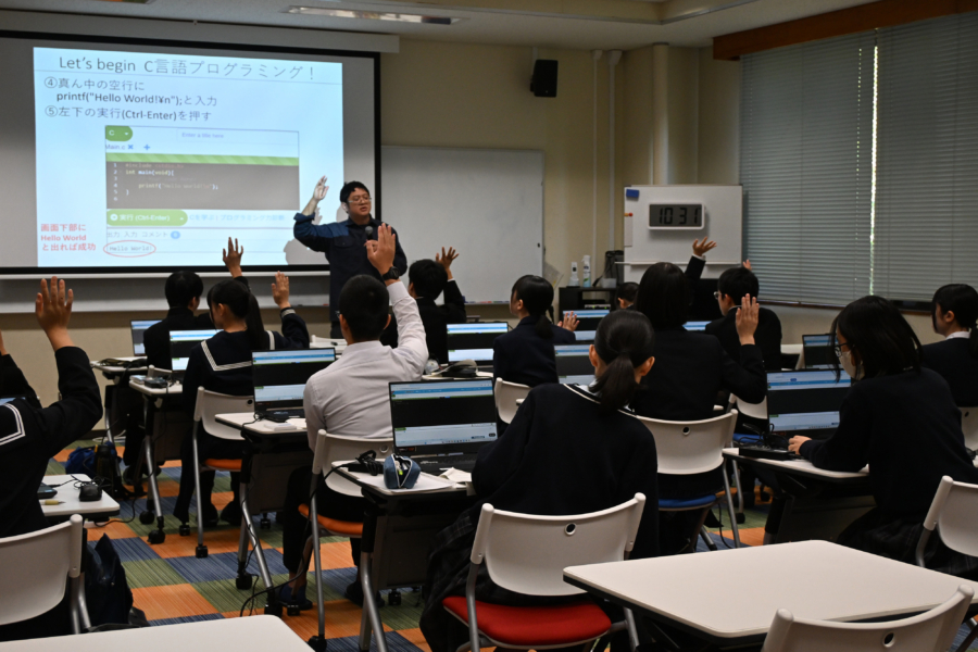 参加した皆さんは教員の指導の下、まずは基本的な命令文を学びました。その後、一人一台のノートパソコンを使って、実際にプログラミング課題に取り組みました。