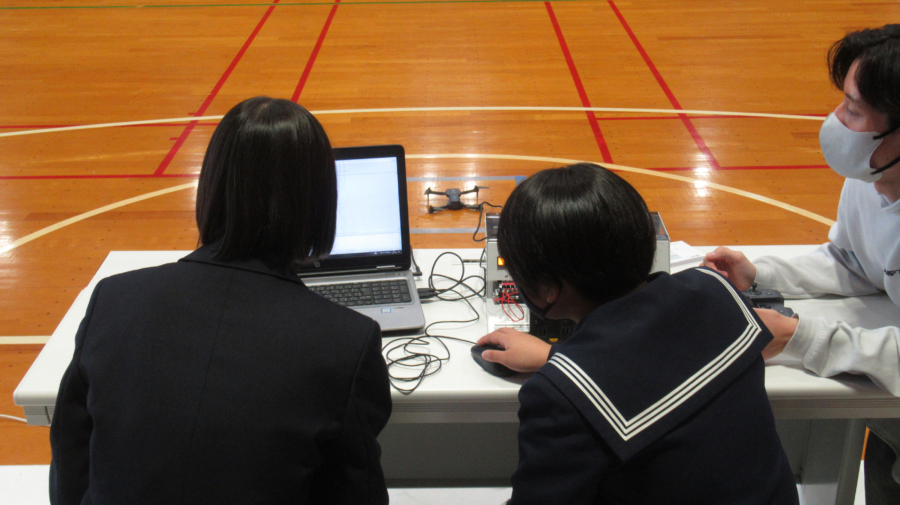 体育館では「PLCによるドローン制御」と題し、ノートパソコンと制御用コンピュータ、変換器を用いて、ドローンの動きをプログラムして思い通りに動かす方法を体験しました。