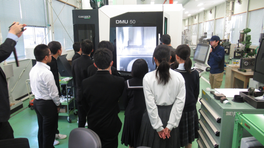 実習工場では、製図ソフトや機械制御用ソフトを用いてプログラムを生成し、自動化された工作機械を動かす様子を目の前で見学しました。