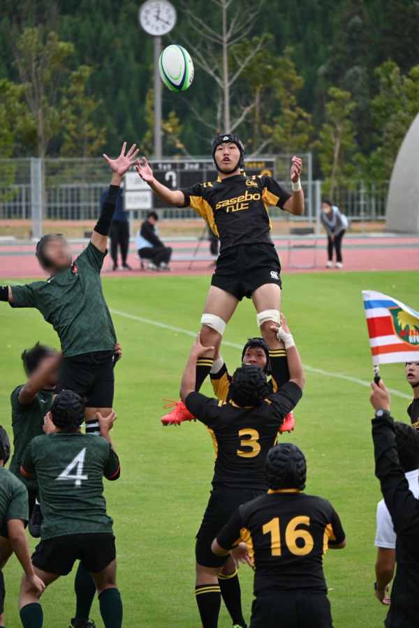| 私たちの初戦は都城高専との対戦で、結果は81対0で勝利しました。 風向きやスペースを上手く活用し、主導権を握りながら相手を翻弄する展開に持ち込むことができました。 2試合目は、春季大会では勝利したものの、秋の大会では過去6連敗している久留米高専との対戦でした。 前半は立ち上がりこそ良かったものの風向きの影響もあり、7対12とリードを許す展開となりました。しかし後半はキックを多用してエリアを獲得し、試合の9割以上を相手陣で進めることが出来ました。その結果、29対12で逆転勝利を収め、7年ぶりとなる九州大会優勝を果たすことができました。 応援してくださった皆様に、心より御礼申し上げます。 次は、来年1月5日に全国大会の初戦が控えております。より良い結果を残せるよう、一同全力で臨んで参りますので、引き続きご声援のほどよろしくお願い申し上げます。 機械工学科 4年 ラグビー部キャプテン 山本武弥 |