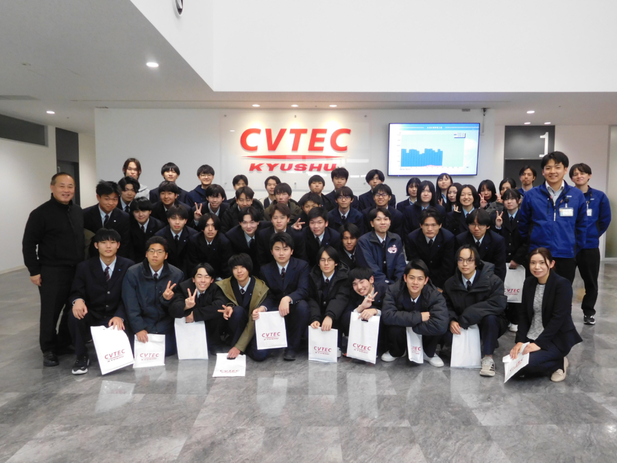 株式会社シーヴイテック九州様では、企業の概要や自動車用無段変速機(CVT)の金属ベルトに関する説明を受けた後、工場内では実際の製造現場を見学させていただくとともに、各工程における細やかな技術力や品質チェックの方法についてご説明いただきました。
