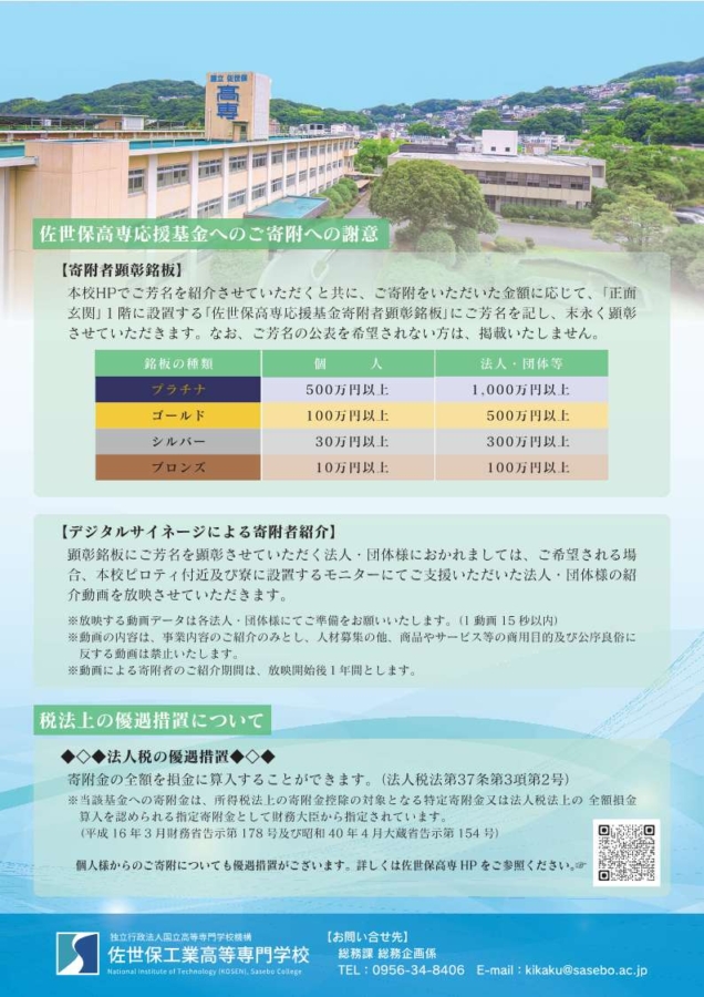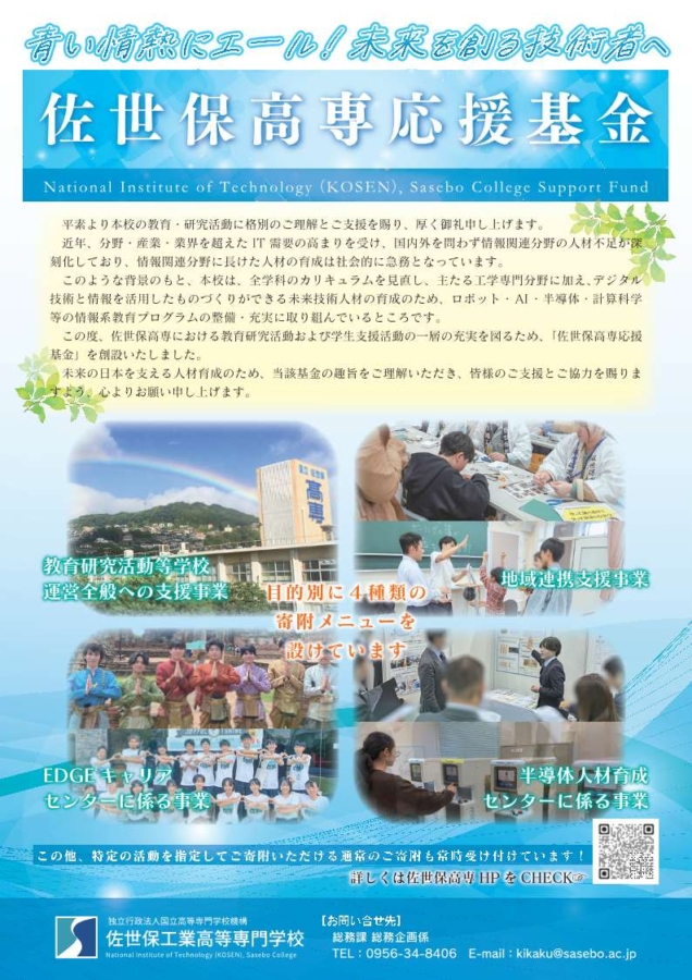 この度、佐世保高専における教育研究活動および学生支援活動の一層の充実を図るため、「佐世保高専応援基金」を創設し、寄附金の募集を開始いたしました。