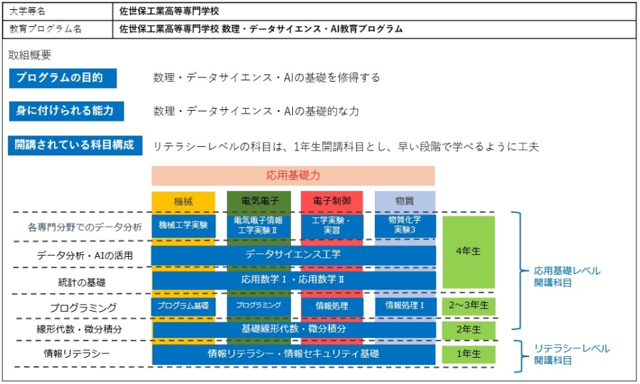 平成29年度には、”KOSEN4.0″イニシアティブ事業「数理情報系の素養を身につけた地域産業の進化(深化)に貢献する“T型”エンジニアの育成」により、全学科での数理情報・AI教育カリキュラムを設計。